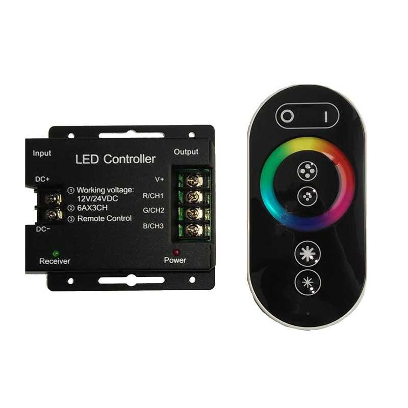 RGB controller KM-RGB-11, 3x6A 12V/216W 24V/432W s RF prenosom, slúži na ovládanie RGB pásov s možnosťou nastavenia rôznych statických farieb svetlá, alebo spustenia viacerých dynamických programov. Pri nastavení statickej farby je možné zvýšiť / znížiť intenzitu osvetlenia, pri spustenom programe je možné zvýšiť / znížiť rýchlosť programu.