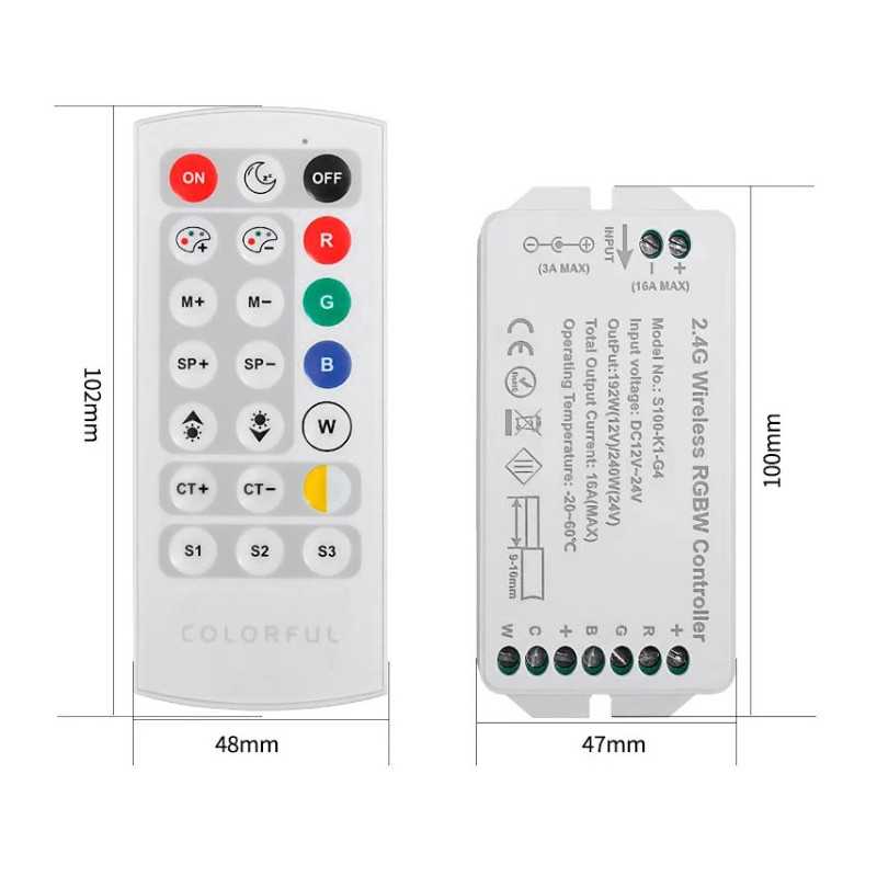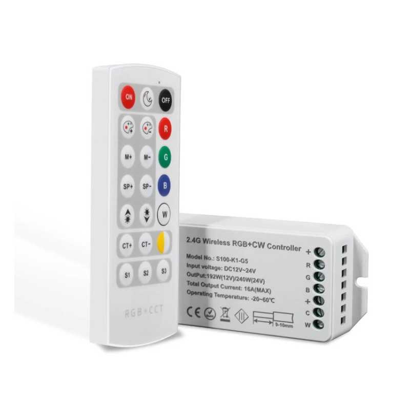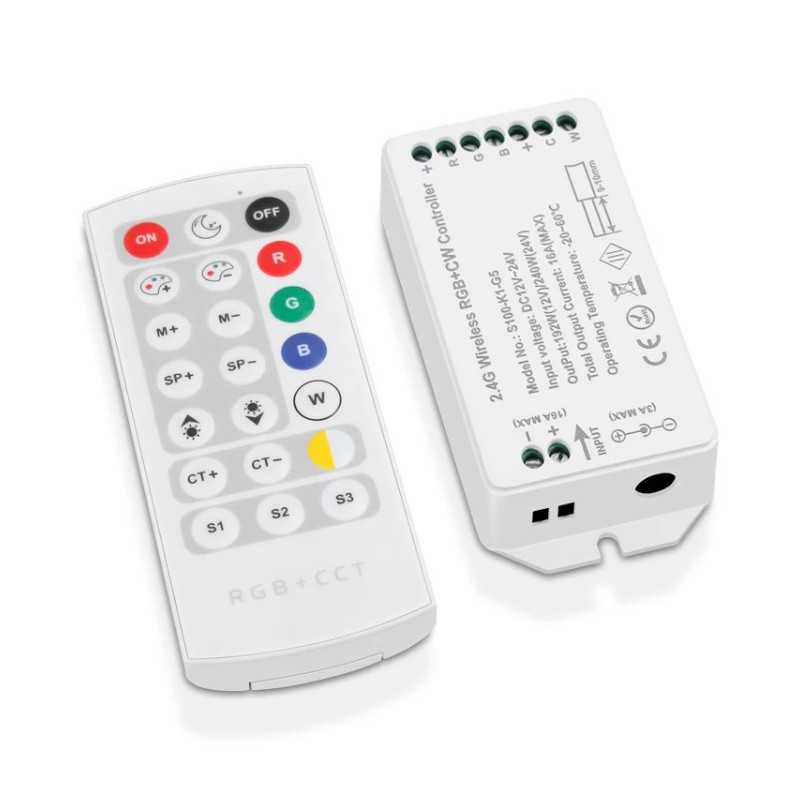 RGB+WW+CW controller KM-RGB+WW+CW-10 12V-192W, 24V-240W s RF prenosom, slúži na ovládanie RGB+WW+CW pásov s možnosťou nastavenia rôznych statických farieb svetlá vč. samostatnej teplej bielej - studenej bielej, alebo spustenia viacerých dynamických programov. Pri nastavení statickej farby je možné zvýšiť / znížiť intenzitu osvetlenia, pri spustenom programe je možné zvýšiť / znížiť rýchlosť programu. Controller má možnosť uložiť tri rôzne nastavenia do pamäte.