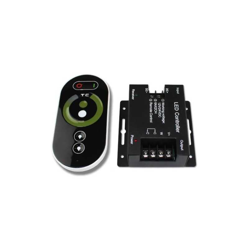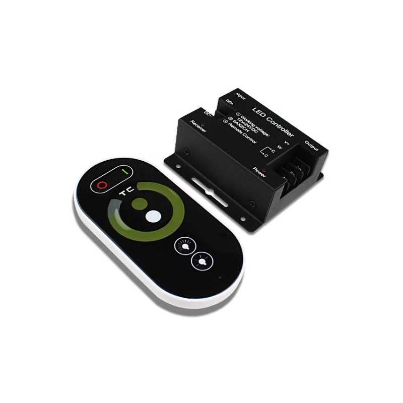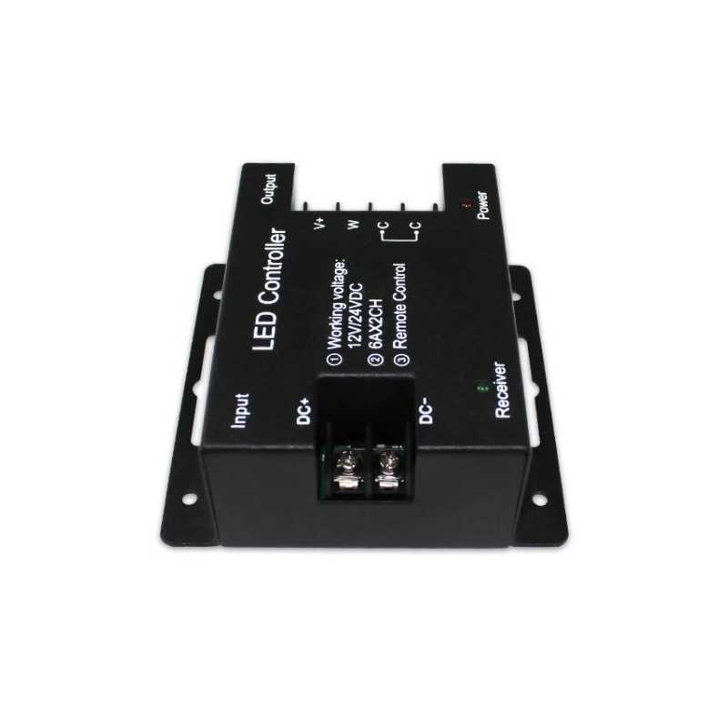 Controller KM-WW+CW-11, 12V-144W, 24V-288W s RF prenosom, pre ovládanie LED pásov vo farbe svetla teplá biela + studená biela. Pri nastavení statickej farby je možné zvýšiť / znížiť intenzitu osvetlenia, pri spustenom dynamickom programe je možné zvýšiť / znížiť rýchlosť programu.
