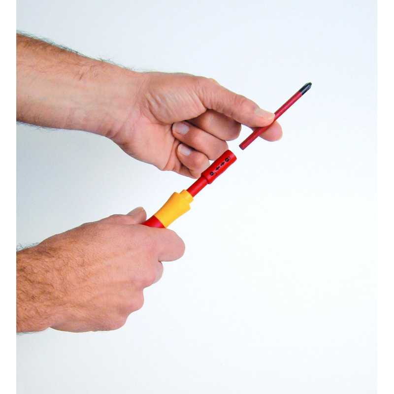 Pri každodennej práci na dieloch pod napätím sa elektrikári často stretávajú s rôznymi profilmi skrutiek. Rukoväť skrutkovača SoftFinish s výmennými nástavcami slimBit je vhodná pre najrôznejšie spôsoby použitia bez toho, aby so sebou musíte nosiť pre každý profil samostatný skrutkovač. Skrutkovač s ergonomickým tvarom rukoväte s ochranou proti odvaleniu padne dobre do ruky a pri práci šetrí kĺby a šľachy. Vďaka Wiha slimTechnology môžu nástavce slimBit s driekom tenším až o 33% bez problémov dosiahnuť aj k hlboko uloženým skrutkám a pružinám. Izolovaná rukoväť skrutkovača a nástavce slimBit boli podrobené kusovej skúške podľa medzinárodnej normy IEC 60900 a umožňujú bezpečnú prácu na dieloch pod napätím do 1000 V AC.
