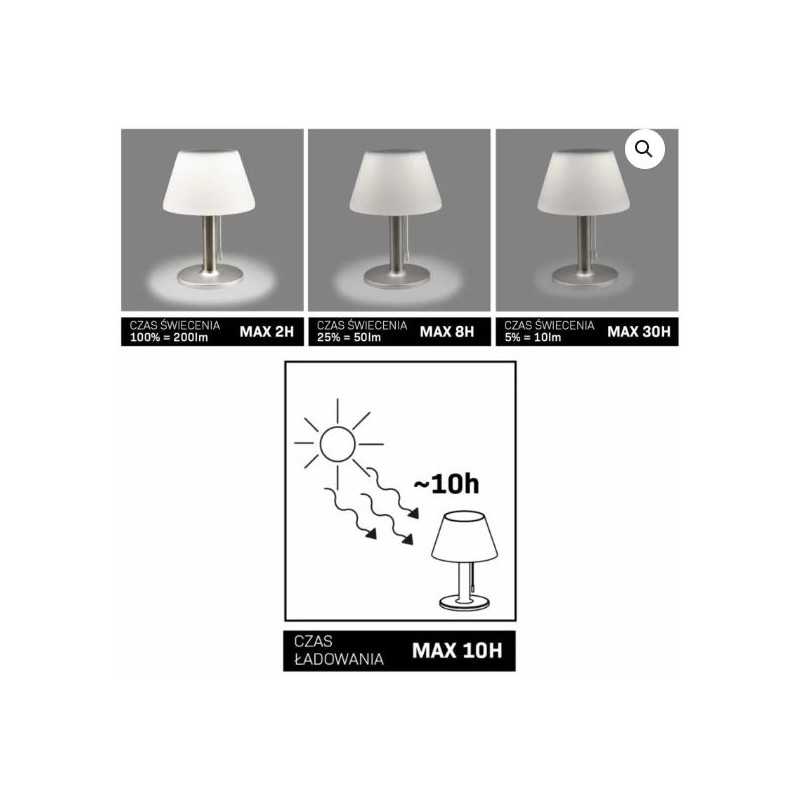 Solárne lampy zároveň zdobia záhradu a znižujú účty za elektrinu. Vďaka špeciálnej intenzite svetla sa používajú ako dekoratívne osvetlenie. Zvýrazňujú atmosféru záhrady, ktorá vďaka nim poteší hrou svetla a tieňa v lete aj v zime. Používajú sa na osvetlenie terás a na zvýraznenie prvkov drobnej záhradnej architektúry. Solárne lampy môžu doplniť rastlinné kompozície. Svietidlo Viola je možné umiestniť na stôl na balkón alebo terasu. Ďalšie informácie: Mechanický vypínač ON/OFF, Zabudovaný súmrakový senzor - automaticky zapne lampu pri súmraku, Doba svietenia po úplnom nabití batérie: max 8 hodín (merané v lete, batéria nabitá za slnečného počasia cez deň), Pred prvým vybudovaním výrobku slnečnému žiareniu aspoň na 10 hodín, Svietidlo má 3 stupne osvetlenia. Doba nabíjania a svietenia: Doba svietenia pri 100% – 200lm / max 2h, Doba svietenia pri 25% – 50lm / max 8h, Doba svietenia pri 5% – 10lm / max 30h, Doba nabíjania max 10 hodín