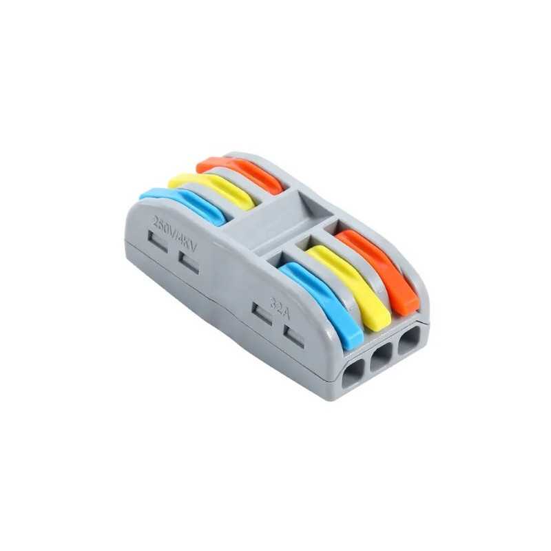 Svorka bezskrutková KM-3P-D-02, obj. kód 73000031, ktorá je určená pre spojenie dvoch trojžilových vodičov nasunutím a zacvaknutím.